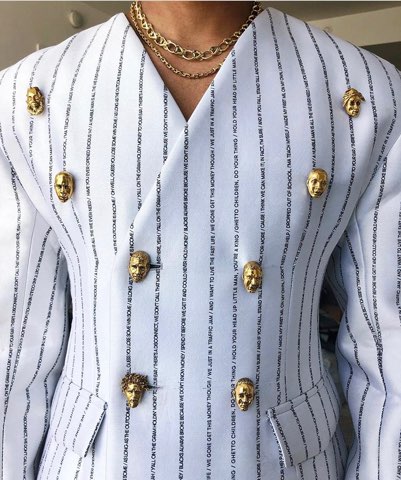 I drew my Met Gala suit about 4 months ago. Custom silk ‘Zoot’ blazer with custom lyrical stripes from some of my favorite rappers. Each line is a bar from Nip, Pac, Jay, Nas, Drake, Meek, Cole and Kendrick. Custom buttons by the brother @JohnnyNelson. pic.twitter.com/B8VuneBedl